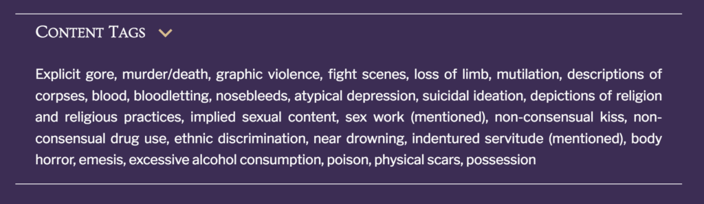 From the author’s website…explicit gore, murder/death, violence, mutilation, corpses, blood, atypical depression, suicidal ideation, depictions of religion and practices, implied sexual content, sex work (mentioned), non-consensual kiss, non-consensual drug use, ethnic discrimination, near drowning, indentured servitude (mentioned), body horror, emesis, excessive alcohol consumption, poison, physical scars, possession.